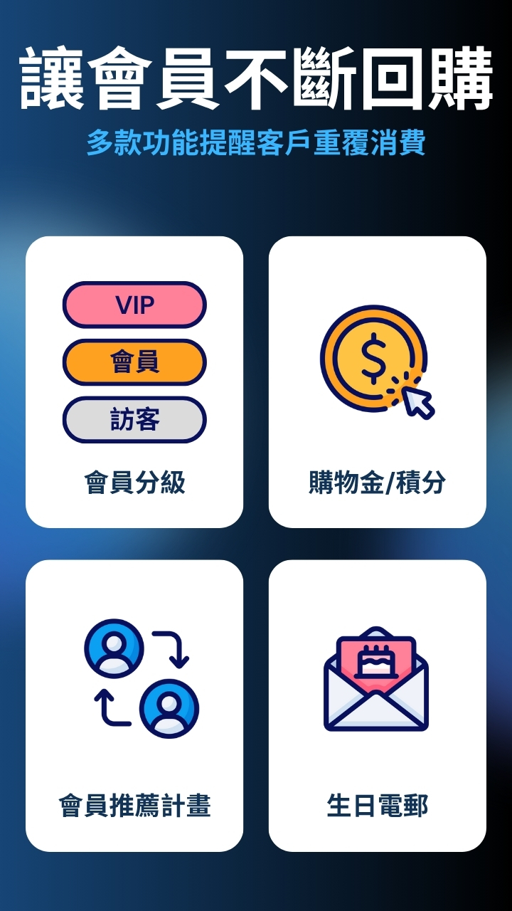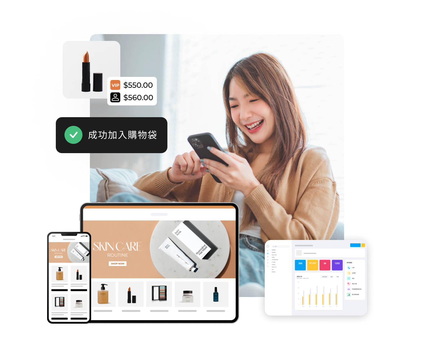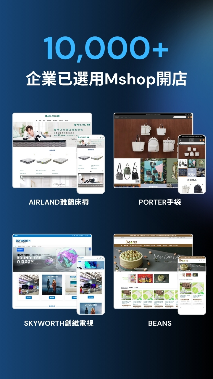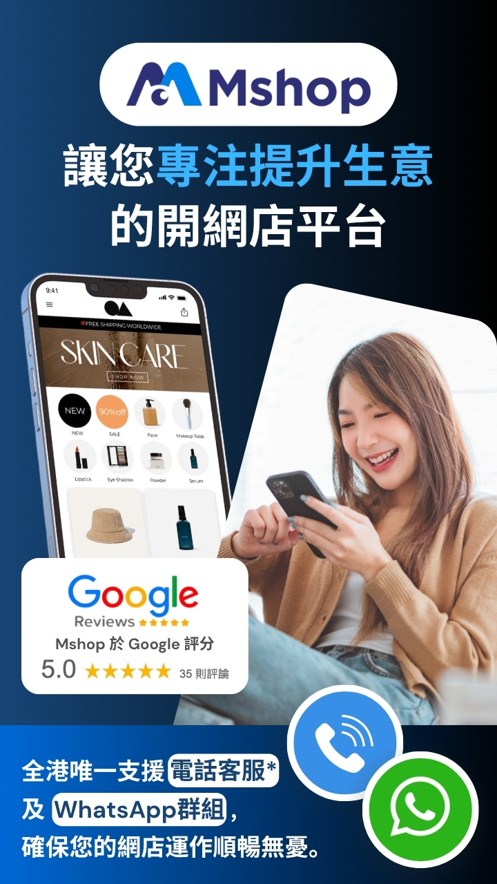 通過Mshop網店平台,商戶只需要平均每月數百元起﹐即可打造自家專屬網店24小時無間斷銷售商品,並在任何裝置上隨時快速管理自家網店﹐Mshop提供全港最好的售後支援讓商戶能夠操作網店無憂無慮。