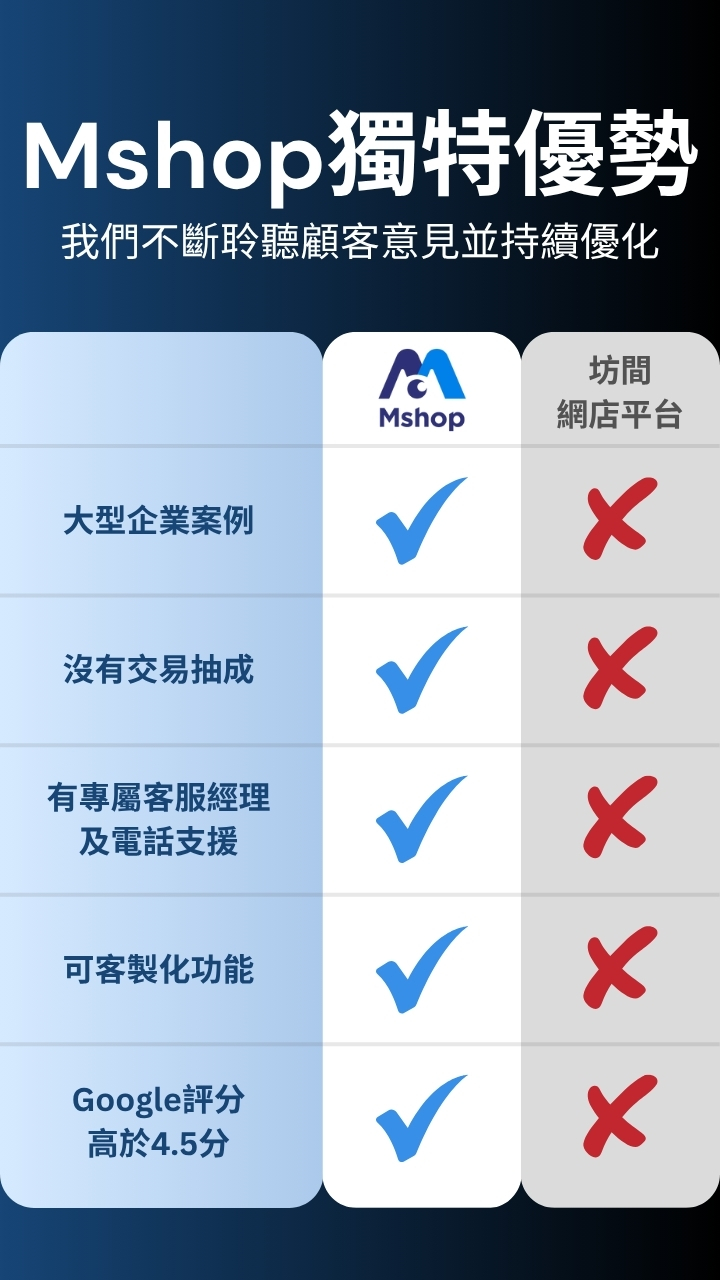 無論您的企業規模如何,Mshop都能根據您的需求提供最適合的網店解決方案。
