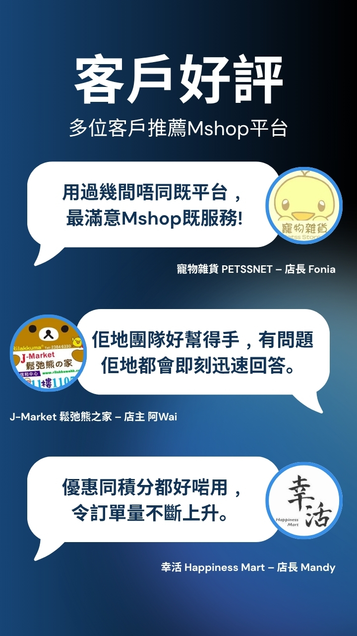 Mshop作為網店平台供應商,非常專業,真正一對一職員查詢 ,服務態度認真,讓我們傳統行業順利走到線上 。開店後,Mshop同事依然細心解決我們提問 ,比其他網店平台更懂客戶需要!