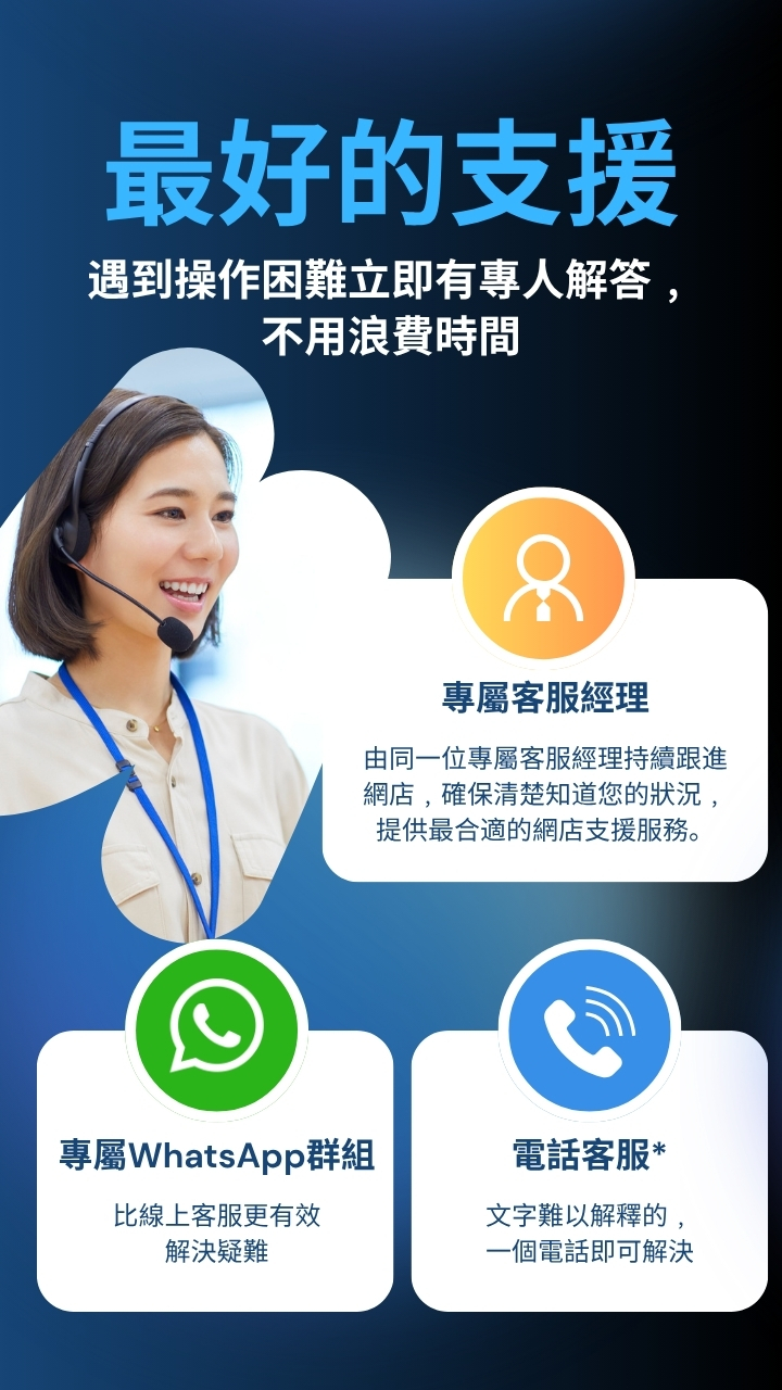 全港唯一支援電話客服*及WhatsApp群組 ﹐確保您的網店運作順利無憂。